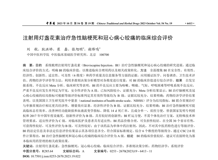 题目:注射用灯盏花素治疗脑梗死的药物经济学评价崔鑫1耿洪娇1李薇2石丰豪2朱贺2谢雁鸣1*韩晟21.中国中医科学院中医临床基础医学研究所,北京100700;2.北京大学医药管理国际研究中心,北京100191